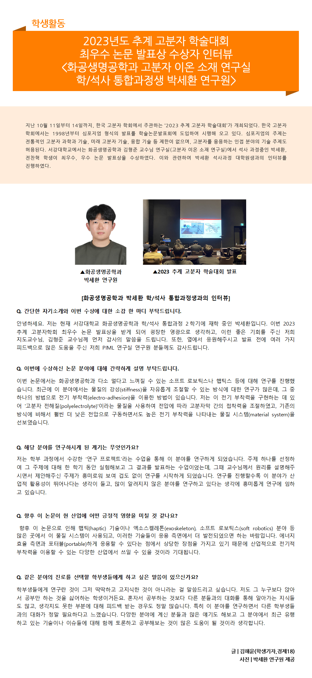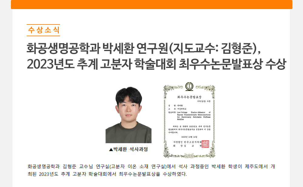 - 화공생명공학과 박세환 연구원(지도교수: 김형준),