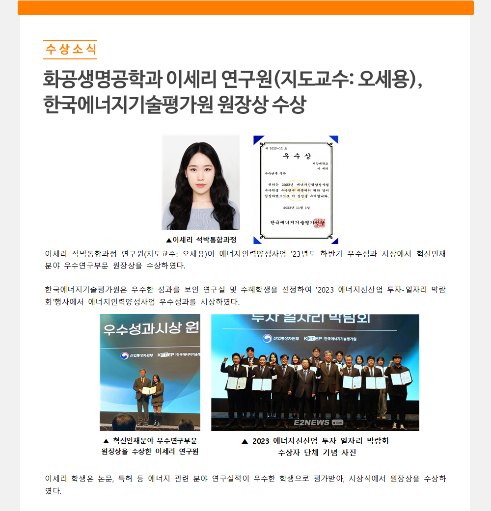 - 화공생명공학과 이세리 연구원(지도교수: 오세용),