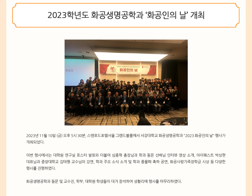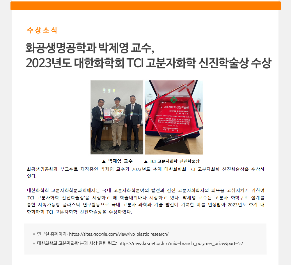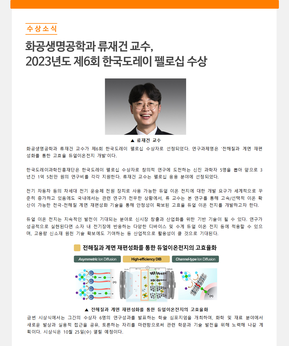 - 화공생명공학과 박제영 교수, 2023년도 대한화학회
