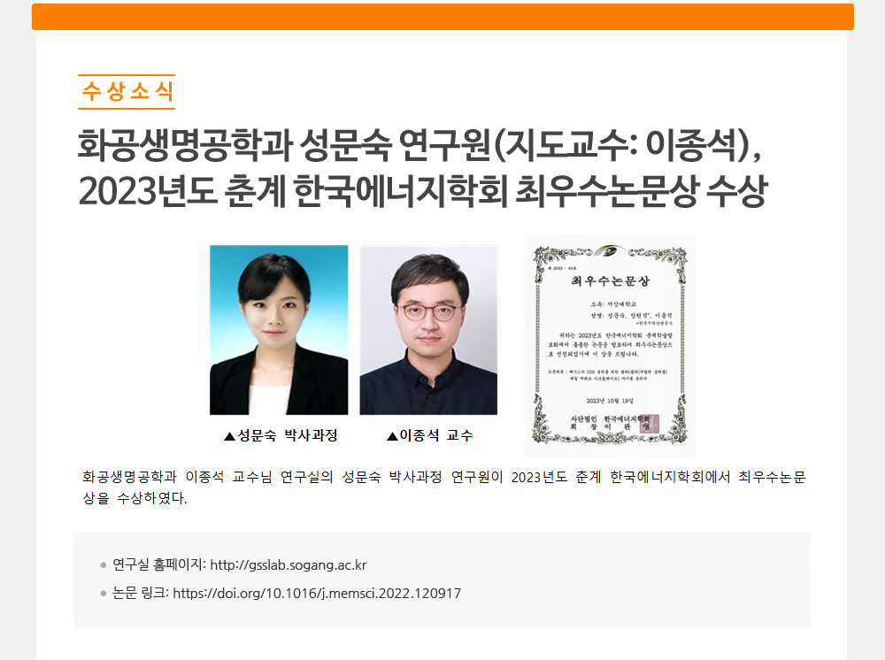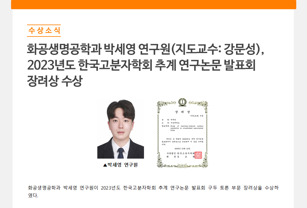 - 화공생명공학과 박세영 연구원(지도교수: 강문성),