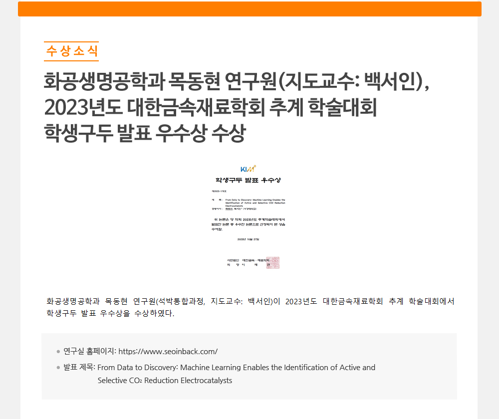 - 화공생명공학과 목동현 연구원(지도교수: 백서인),