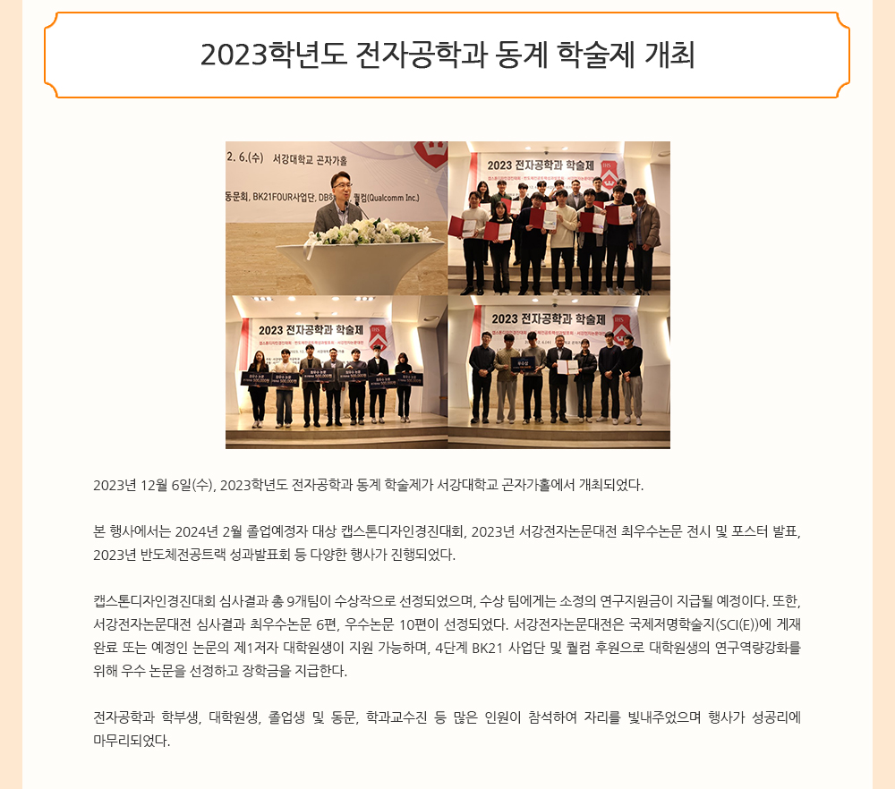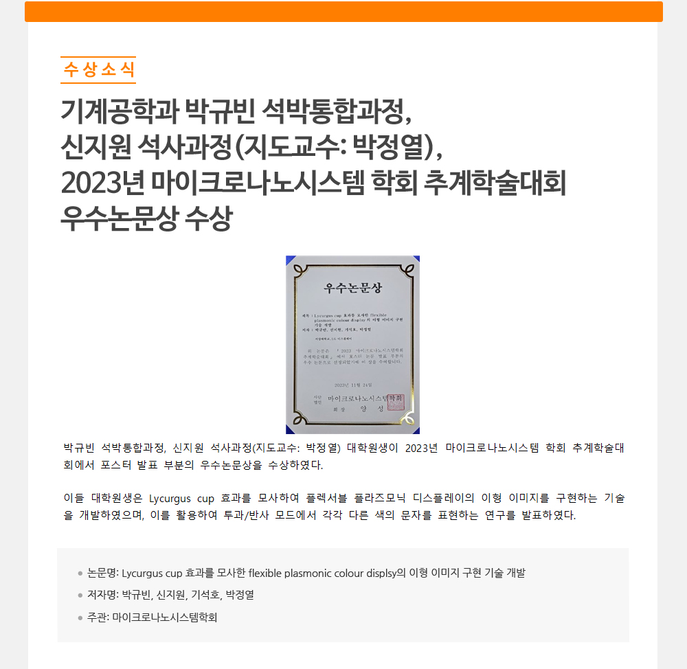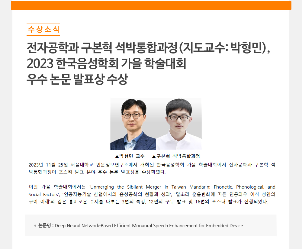 - 전자공학과 구본혁 석박통합과정(지도교수: 박형민),