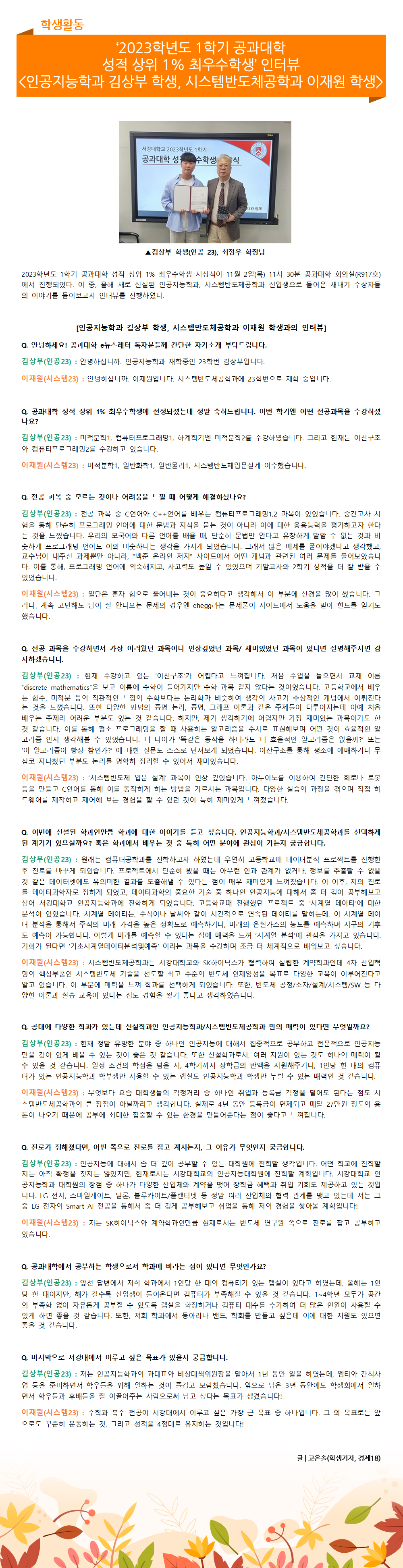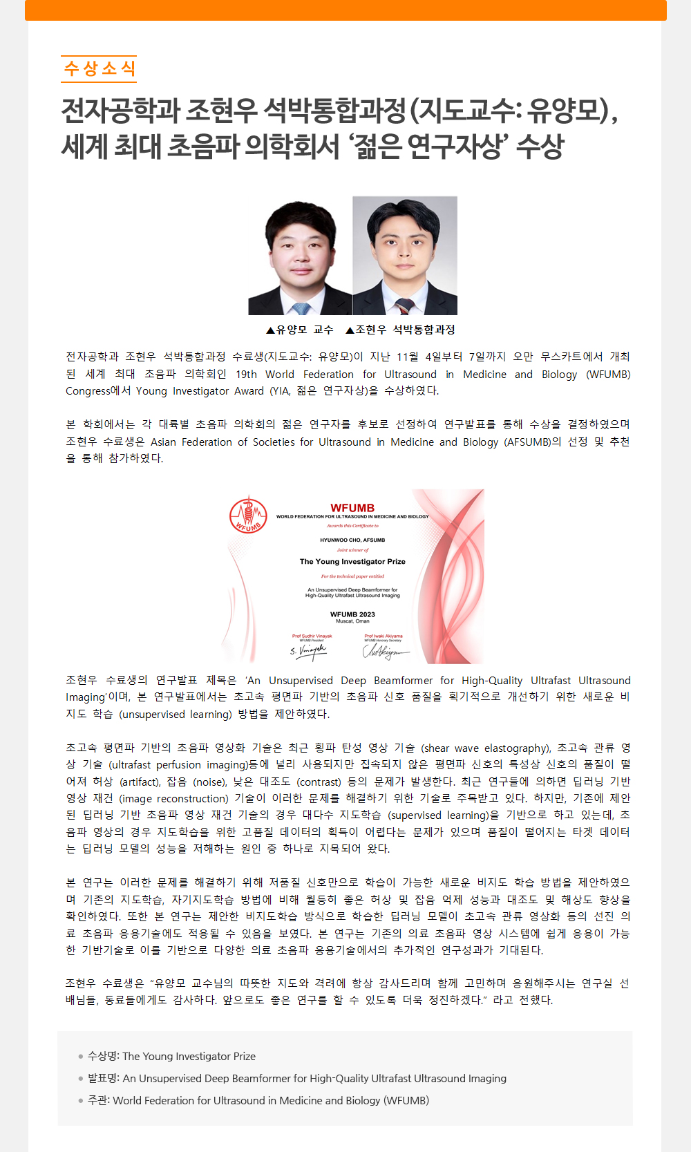 - 전자공학과 조현우 석박통합과정(지도교수: 유양모),