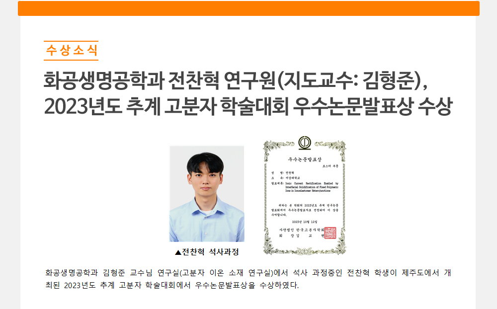 - 화공생명공학과 전찬혁 연구원(지도교수: 김형준),