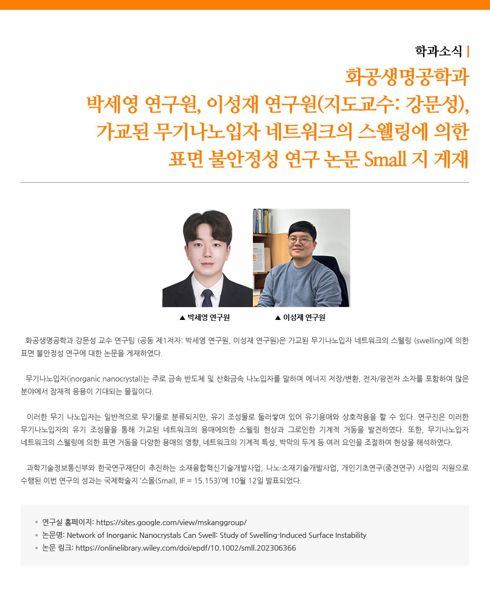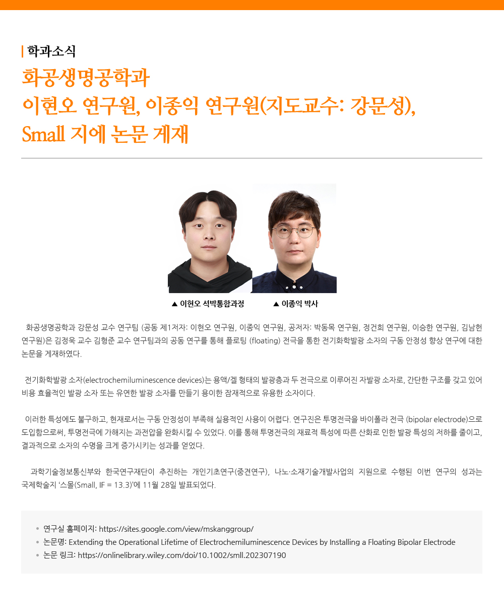 - 화공생명공학과 박세영 연구원, 이성재 연구원