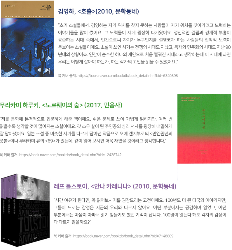 그때 책이 줄 수 있는 놀라운 경험을 스스로 느꼈기 때문에, 더욱 다양한 분야를 탐독하게 됐고 대학에 가면 문학을 꼭 공부해야겠다 다짐했어요. 그리고 진학 후 기회가 되어 문학 수업을 몇 개 듣다 보니까 기대 이상으로 좋더라고요. 자연히 2학년 때 국문학 복수전공을 신청하게 됐죠.