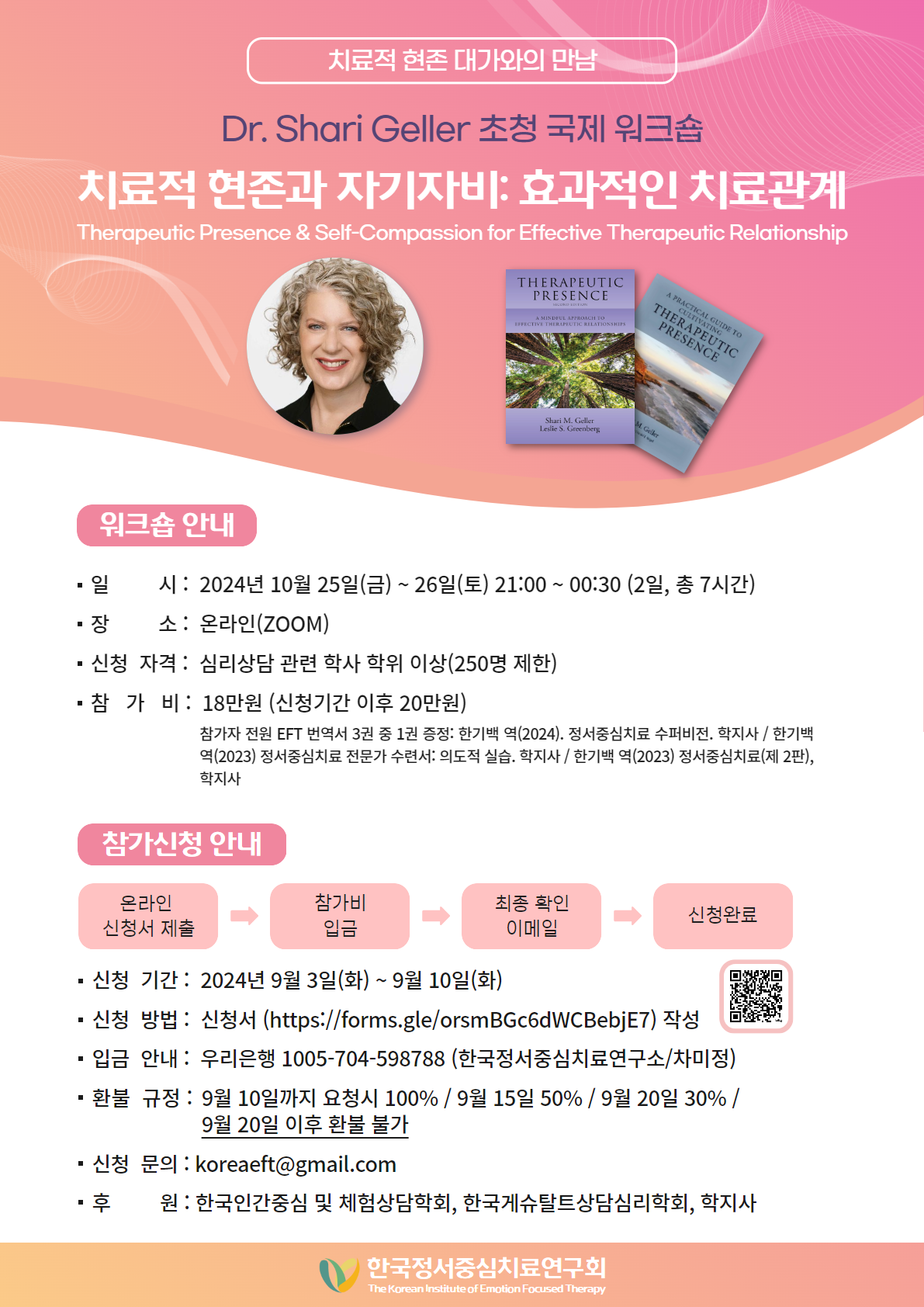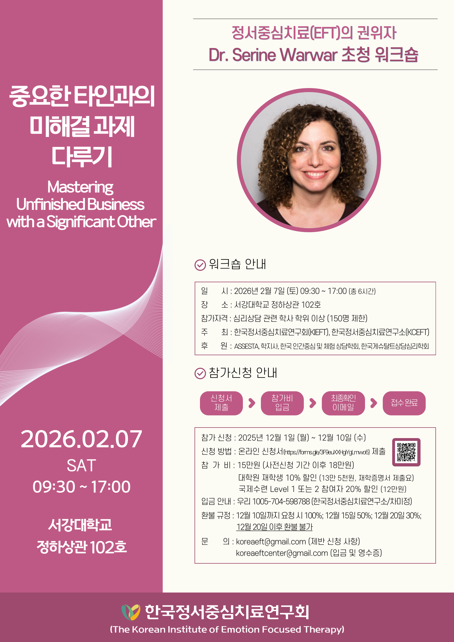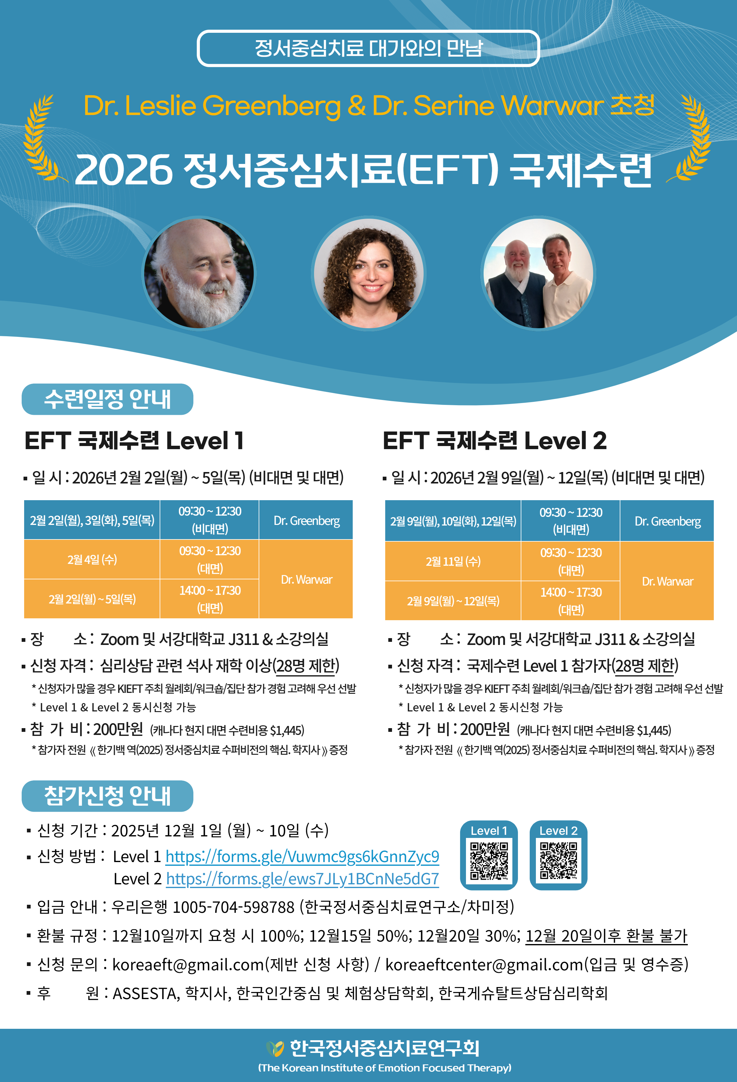 Dr. Leslie Greenberg & Dr. Serine Warwar 초청 정서중심치료(EFT) 국제 수련 1&22025.12.02 | 조회수 : 105 -