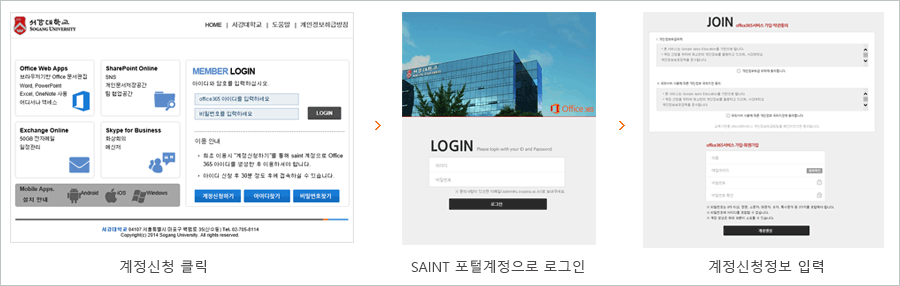 http://o365.sogang.ac.kr에서 계정신청 후 이용(신청 후 30분 후 이용 가능)