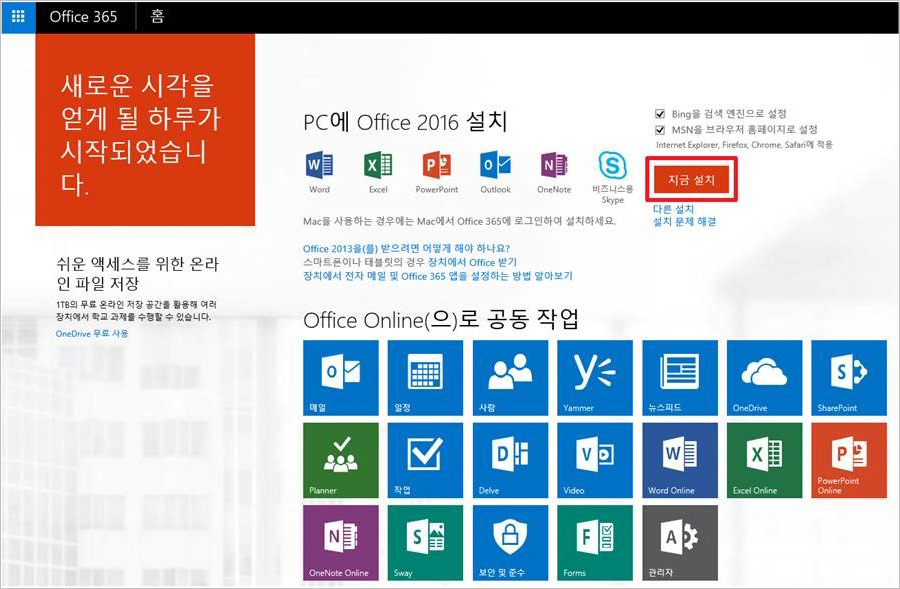- - Microsoft Office ProPlus(PC 설치형) 지원 : 오피스365 포탈에 접속하여 로그인 후, "지금설치" 버튼을 통해 설치가능