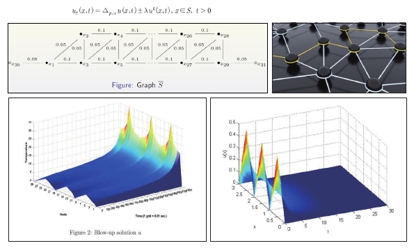 네트웍이란 기본적으로 edge-weight 이 주어진 그래프를 뜻하며, 이러한 네트웍은 분자의 운동, 새떼 또는 물고기 떼의 이동 등 단체를 이루어 서로간의 영향을 받으며 변해가는 다양한 군집의 수학적 표현이다. 이러한 네트웍 위에서 일어나는 다양한 현상 즉 물리화학적 현상을 이산편미분방정식으로 표현하고 그 해의 특성을 수학적으로 분석하는 일을 한다. 특히, 기존의 연속체 위에서의 편미분방정식 이론을 바탕으로 새로운 이산편미분방정식 이론을 확립해가고 이를 활용하여 실생활 속에서의 현상을 분석해 내는 것을 이 연구의 목표로 하고 있다. 이를 위한 연구주제로는 다음과 같은 연구를 진행하고 있다.